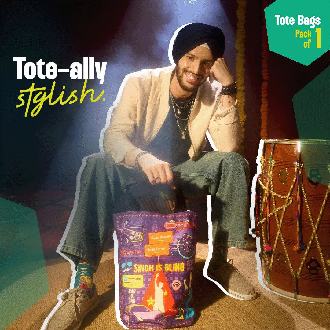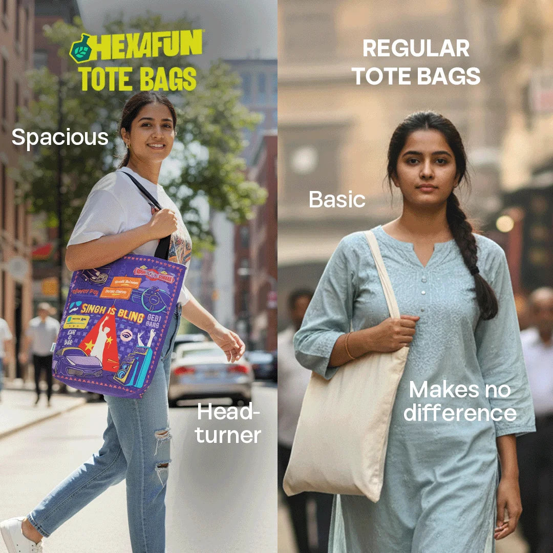 Totes that do more than just hold your stuff? Yes, please! Hexafun’s Singh Is Bling Tote brings full-on pind power. From patiala moves, dhaba moods, and Horn OK Please attitude. Launching Singh Is Bling! Canvas Tote Bag, 100% Organic Cotton, Pack of 1.