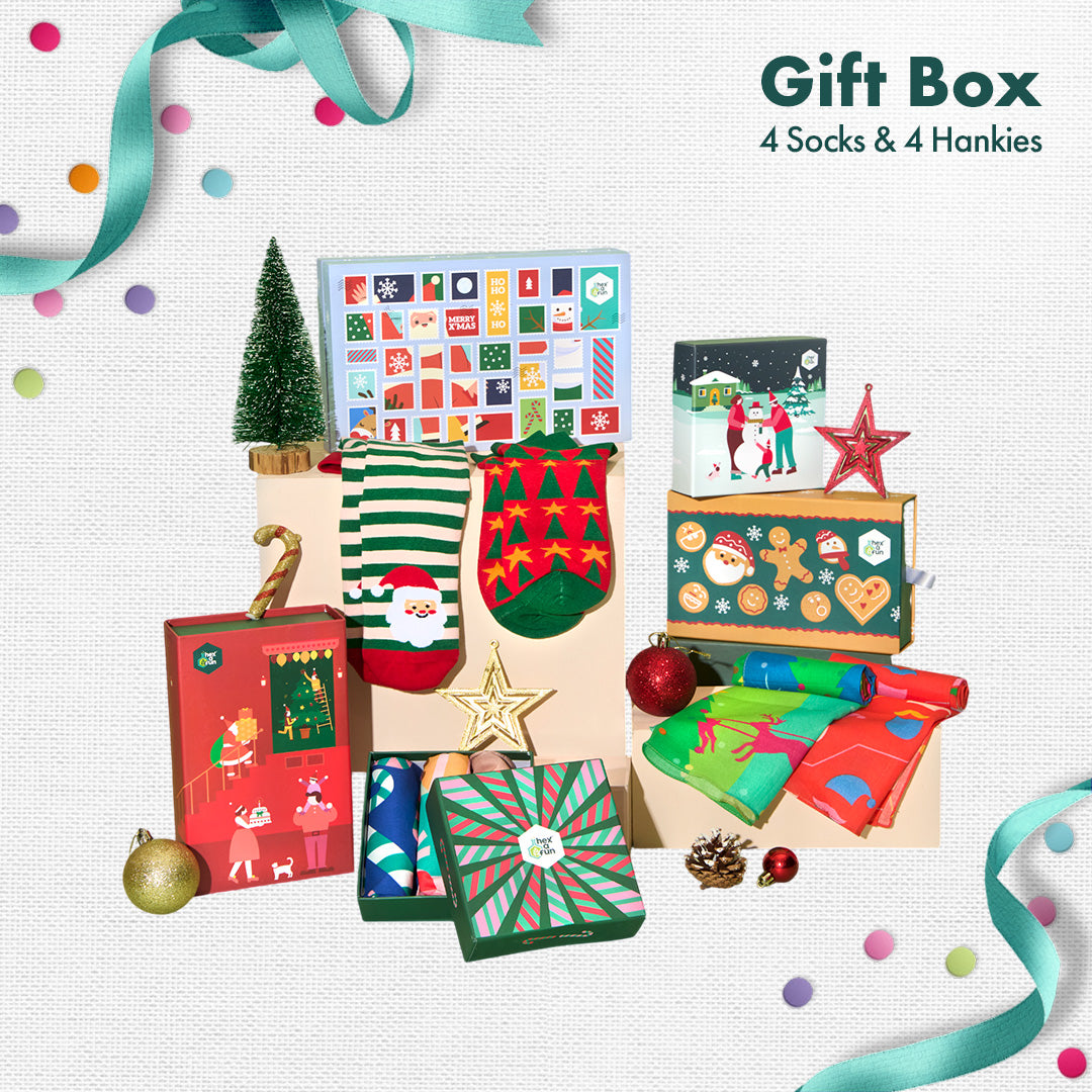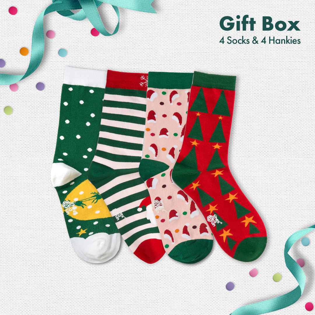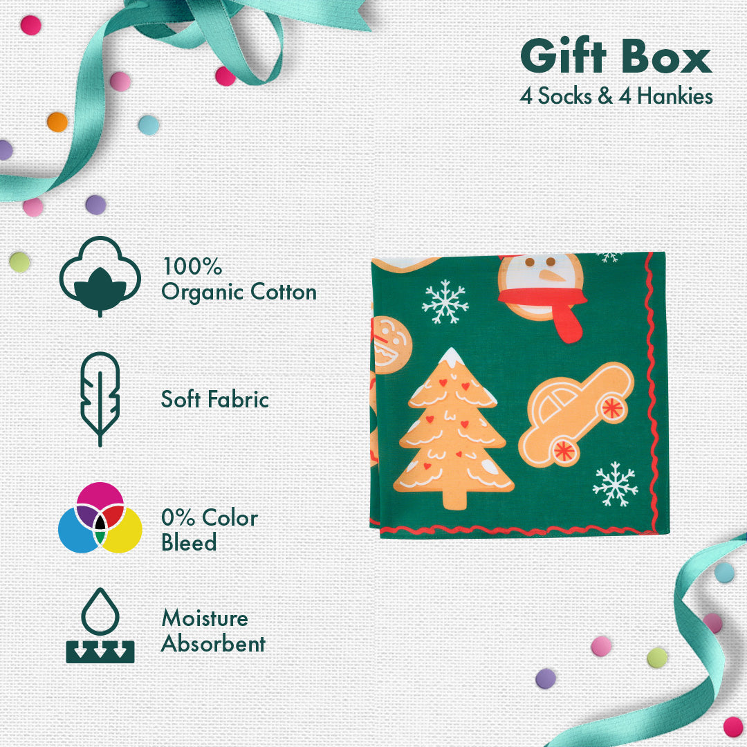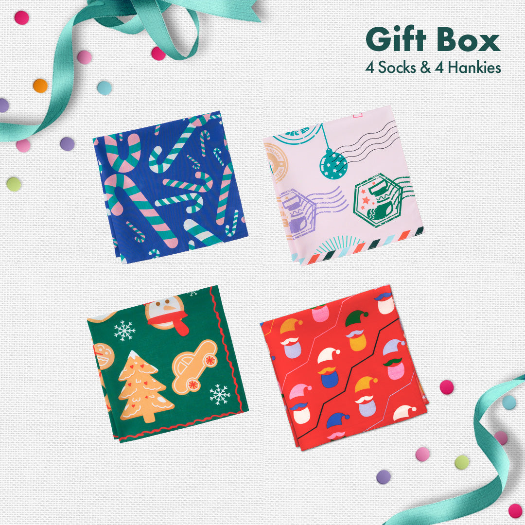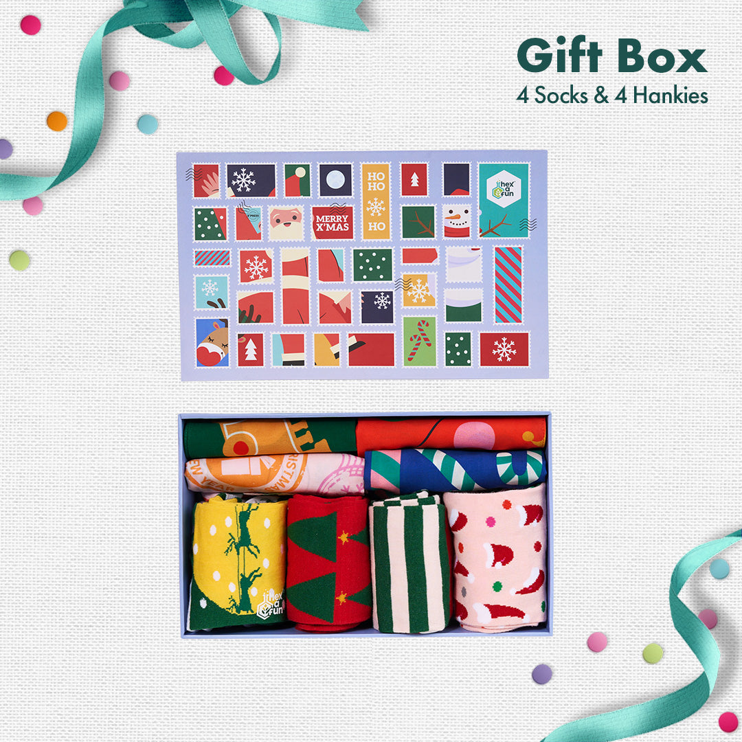 Xmas Stamps! 4 Unisex Crew Length Socks + 4 Unisex Hankies, 100% Organic Cotton, Gift Box of 8