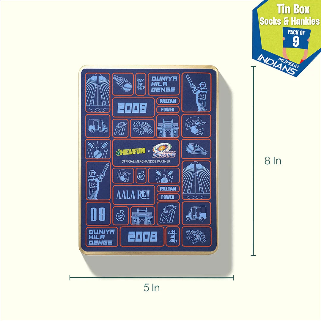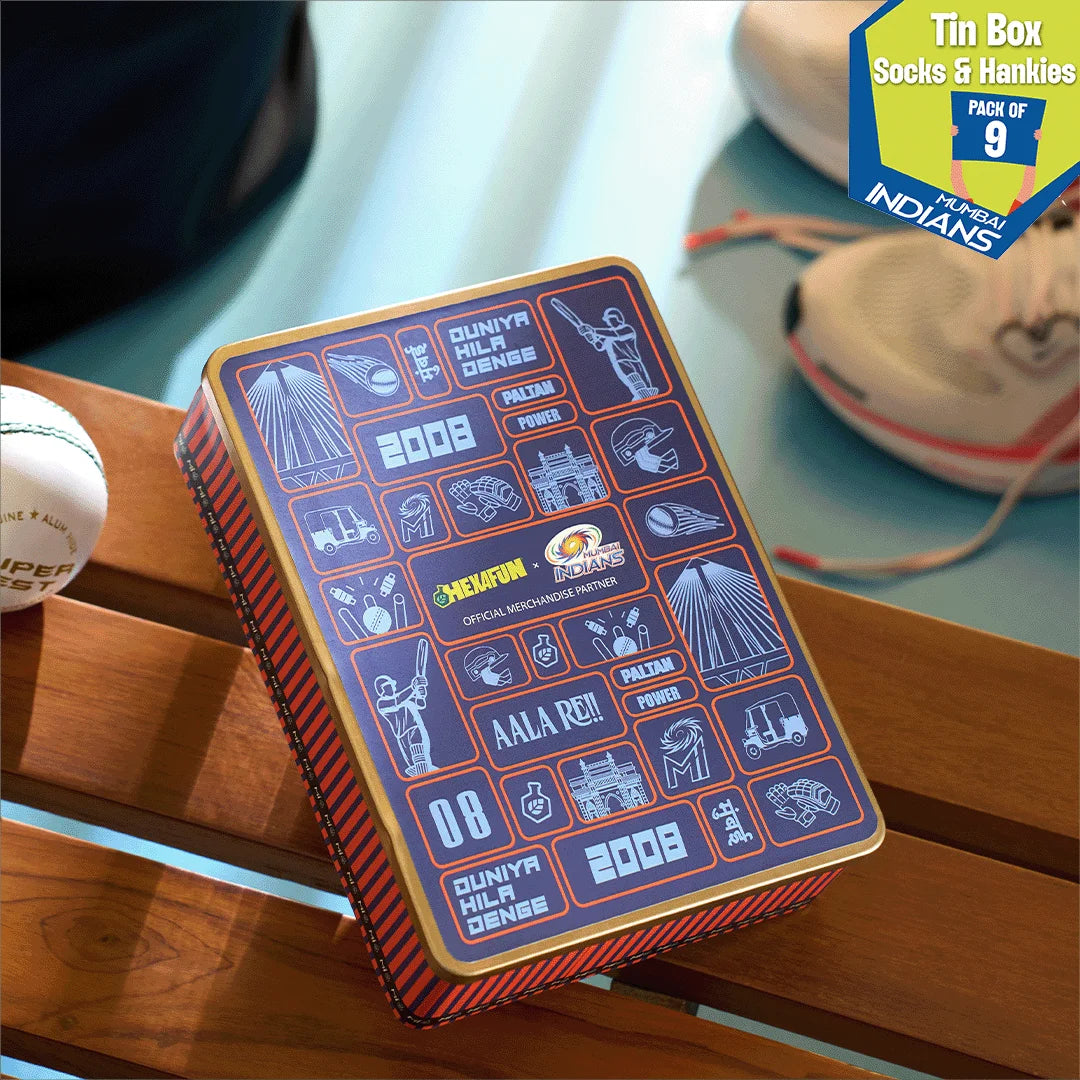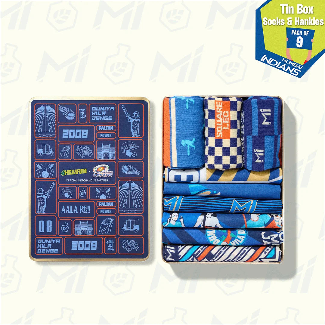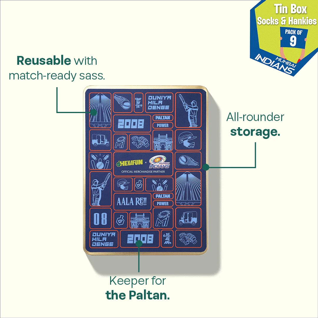 Forget flimsy cardboard. Our tin boxes are built like a death-over defense - solid, stylish, and meant to last. It’s the ultimate collectible for the fan who wants their gear stored in something as iconic as the trophy cabinet. Gift your Paltan Mumbai Indians gift boxes. Presenting Hexafun x Mumbai Indians Collection: Duniya Hila Denge! Tin Gift Box, 6 Unisex Hankies + 3 Unisex Crew Length Socks, 100% Sustainable, Box of 9.