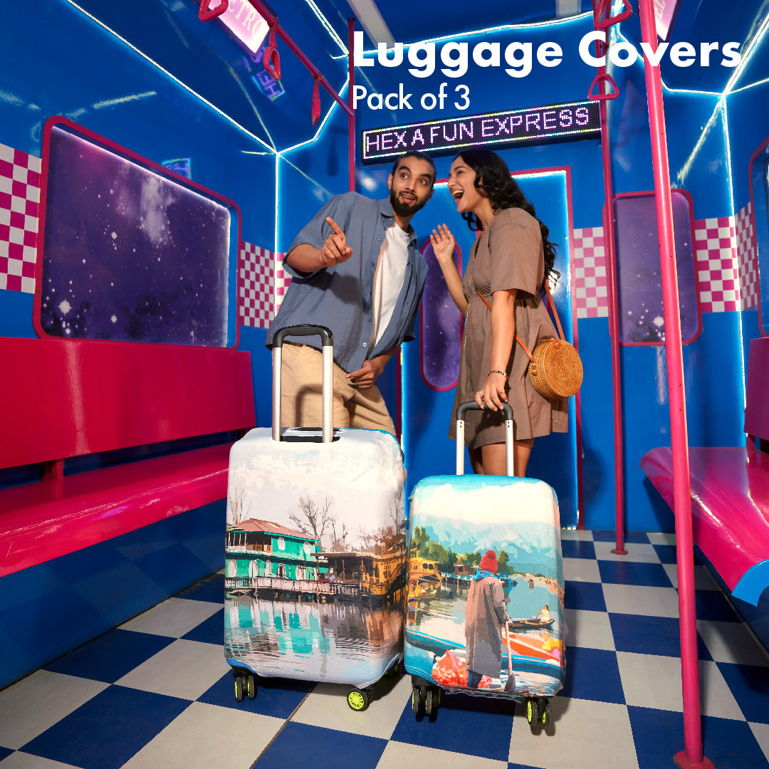Say sayonara to the days of your plain suitcase blending into the crowd! Give it a fresh makeover with hexafun's vibrant and funky luggage covers. Your suitcase will stand out like a celebrity on the conveyor belt, turning heads and sparking envy wherever you go. Step into the world of the Kashmir Calling! Luggage Covers, 100% Organic Cotton Lycra, Small+Medium+Large Sizes, Pack of 3.Â