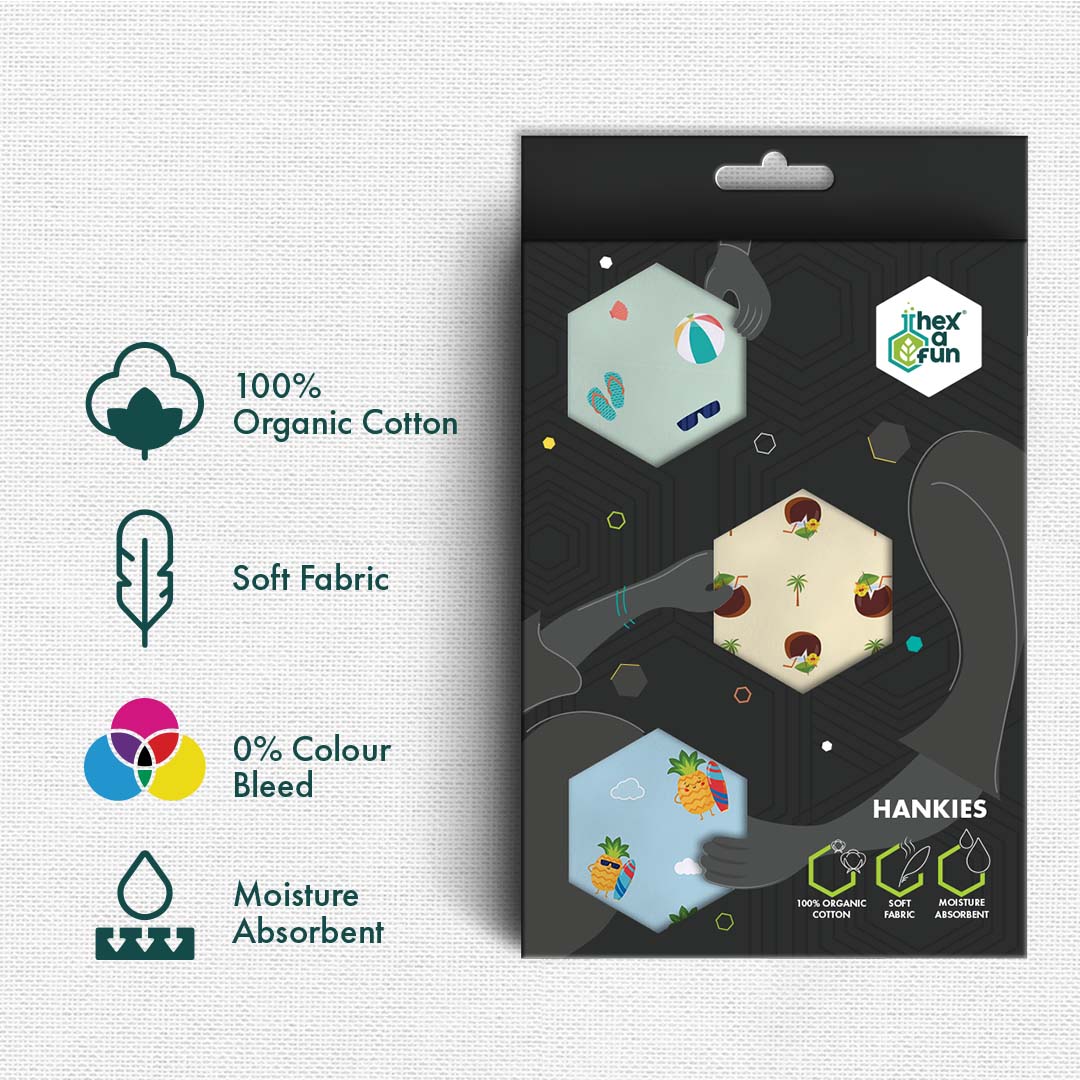 The age of dull, boring, and monotonous hankies ends right here. hexafun to the rescue! And with us begins a new era full of color, playfulness, and the quirkiest prints anyone’s ever seen. The very first of its kind and here to stay forever. Make a splash this summer with the Beach Please! Unisex Hankies, 100% Organic Cotton, Pack of 3.