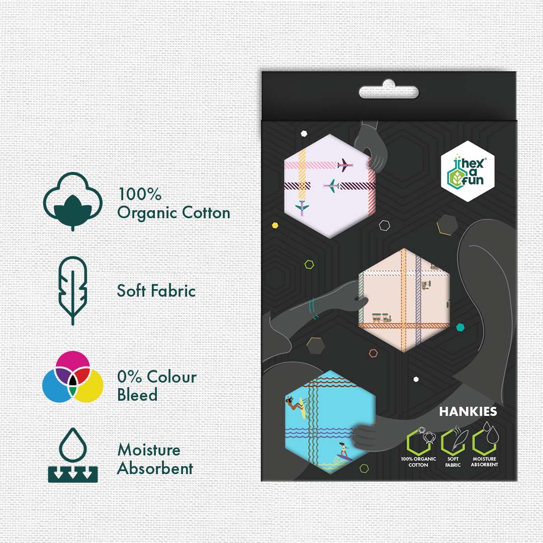 The age of dull, boring, and monotonous hankies ends right here. hexafun to the rescue! And with us begins a new era full of color, playfulness, and the quirkiest prints anyone’s ever seen. The very first of its kind and here to stay forever. Unhide your fun side with our TBC! The Boss Collection! Unisex Hankies, 100% Organic Cotton, Pack of 3.