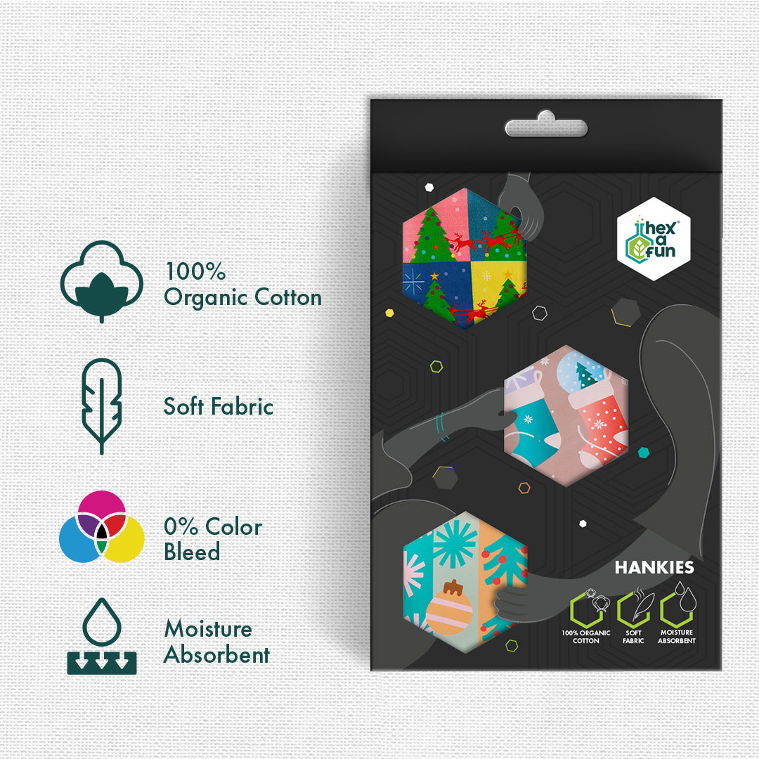 The age of dull, boring, and monotonous hankies ends right here. hexafun to the rescue! And with us begins a new era full of color, playfulness, and the quirkiest prints anyone’s ever seen. The very first of its kind and here to stay forever. Get to know Sant-astic! Unisex Hankies, 100% Organic Cotton, Pack of 3.