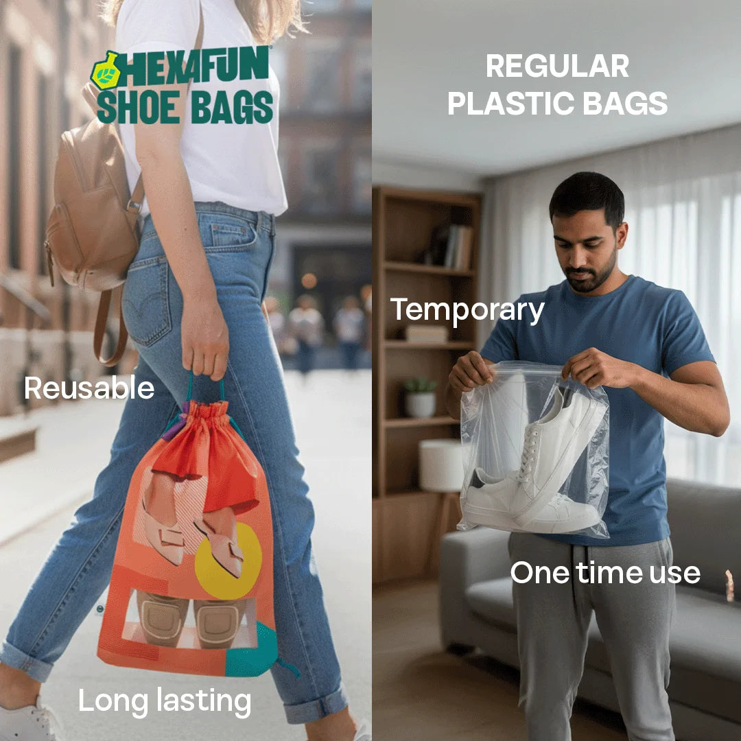 Bid farewell to the ugly, bulky shoe box and welcome shoe bags into your life. Thanks to Hexafun, your shoes have found their perfect right swipe. After a day of running helter-skelter, your shoes can take shelter anywhere. Uncovering the mystery of Shoe Bizz! Unisex Shoe Bag, 100% Organic Cotton, Pack of 6.