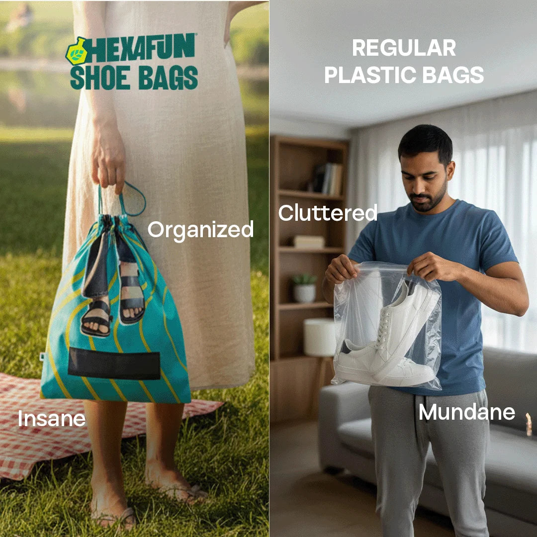 Bid farewell to the ugly, bulky shoe box and welcome shoe bags into your life. Thanks to Hexafun, your shoes have found their perfect right swipe. After a day of running helter-skelter, your shoes can take shelter anywhere. Paving the way for Shoe-topia! Unisex Shoe Bag, 100% Organic Cotton, Pack of 6.