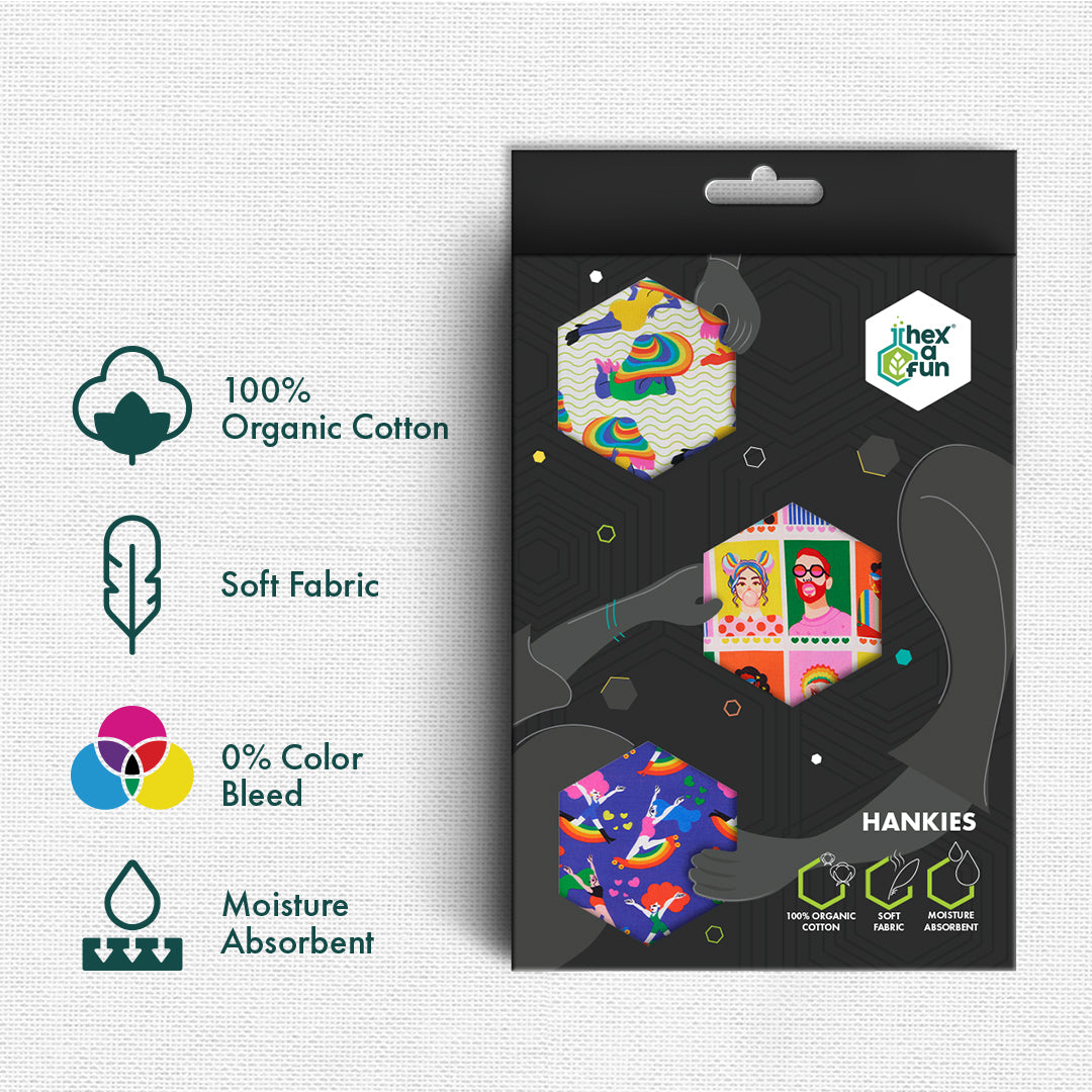 The age of dull, boring, and monotonous hankies ends right here. hexafun to the rescue! And with us begins a new era full of color, playfulness, and the quirkiest prints anyone’s ever seen. The very first of its kind and here to stay forever. Say hello to Self Love Club! Unisex Hankies, 100% Organic Cotton, Pack of 3.